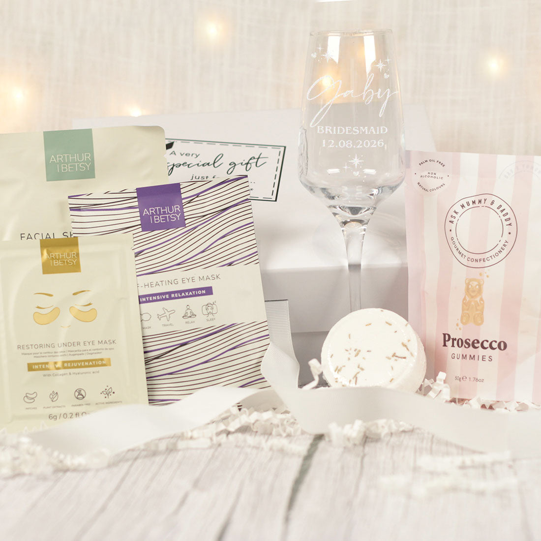 • An engraved champagne flute for the recipient to enjoy a glass of their favourite bubbly. The glass is engraved with their name, bridal party role and wedding date to act as a treasured keepsake to mark the special day.