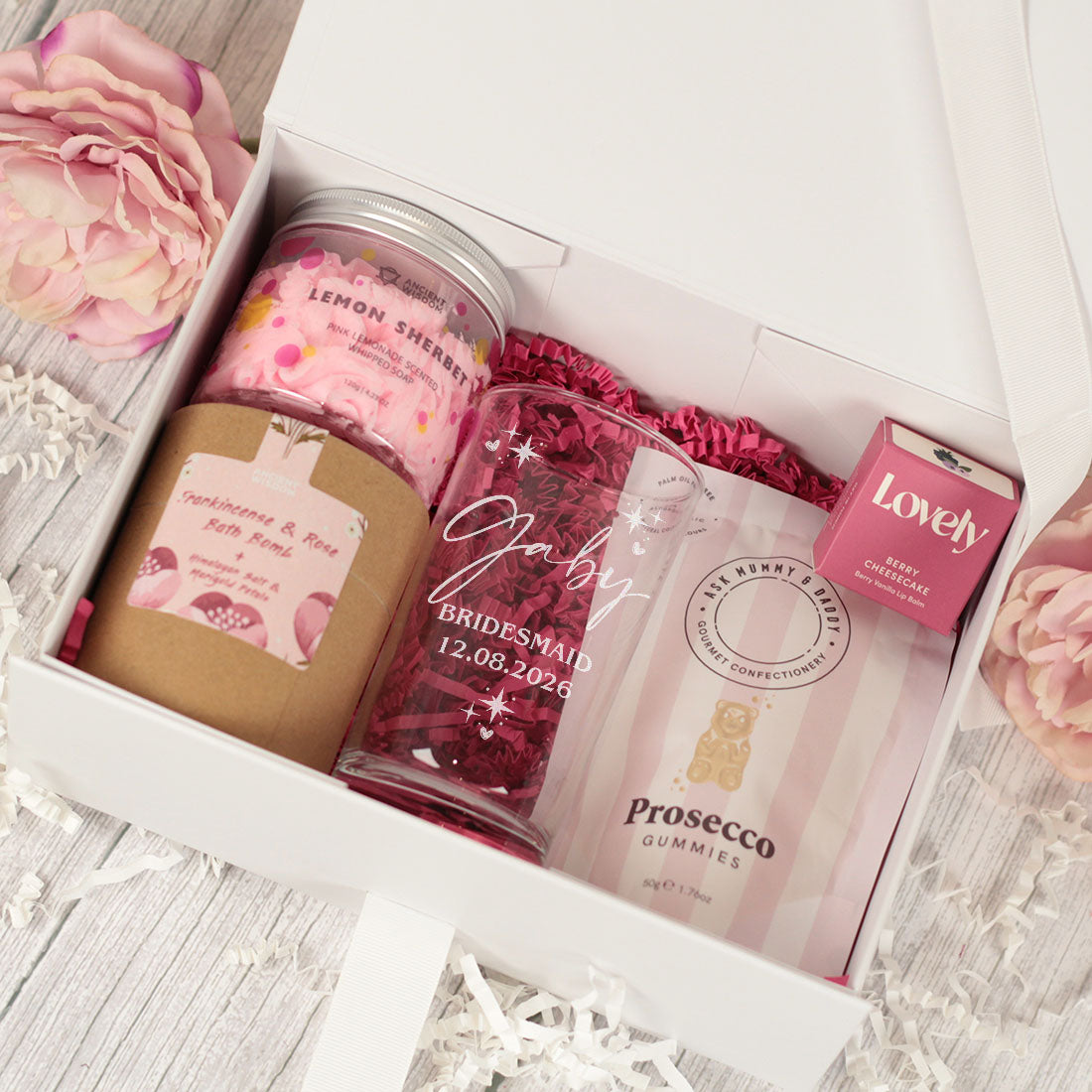 The gifts are all neatly presented in a luxury white gift box with crinkle paper filling and a gift tag.