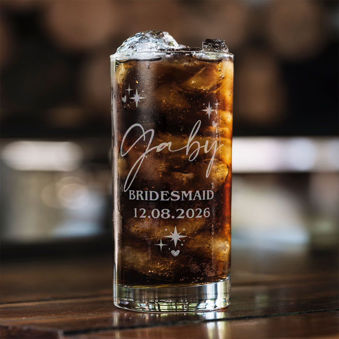 • An engraved 1/2 pint highball glass which is versatile for a wide selection of mixers and cordials. The glass is engraved with their name, bridal party role and wedding date to act as a treasured keepsake to mark the special day.