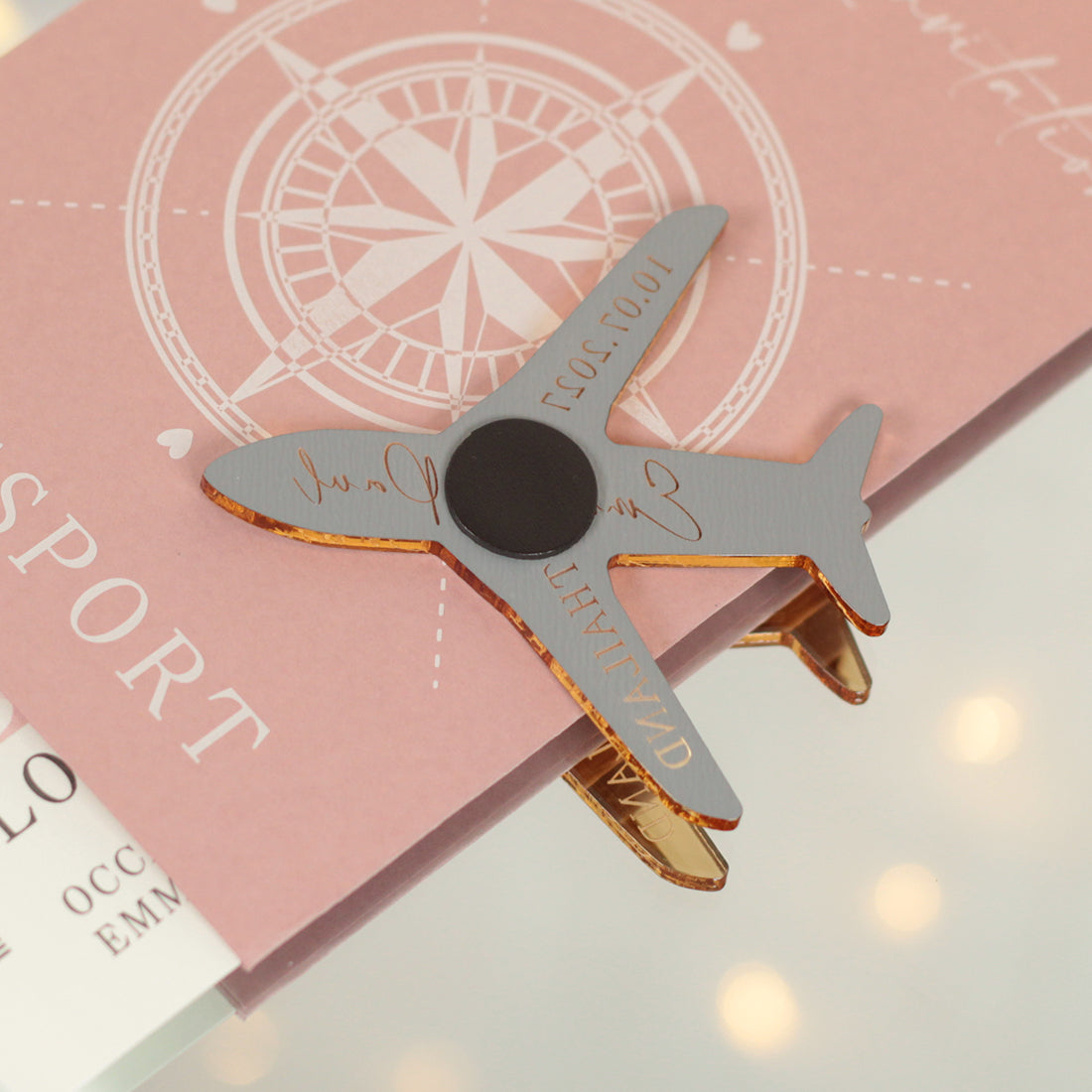 The passport sleeve is finished with a cute detachable aeroplane shaped magnet which is available in a selection of finishes: