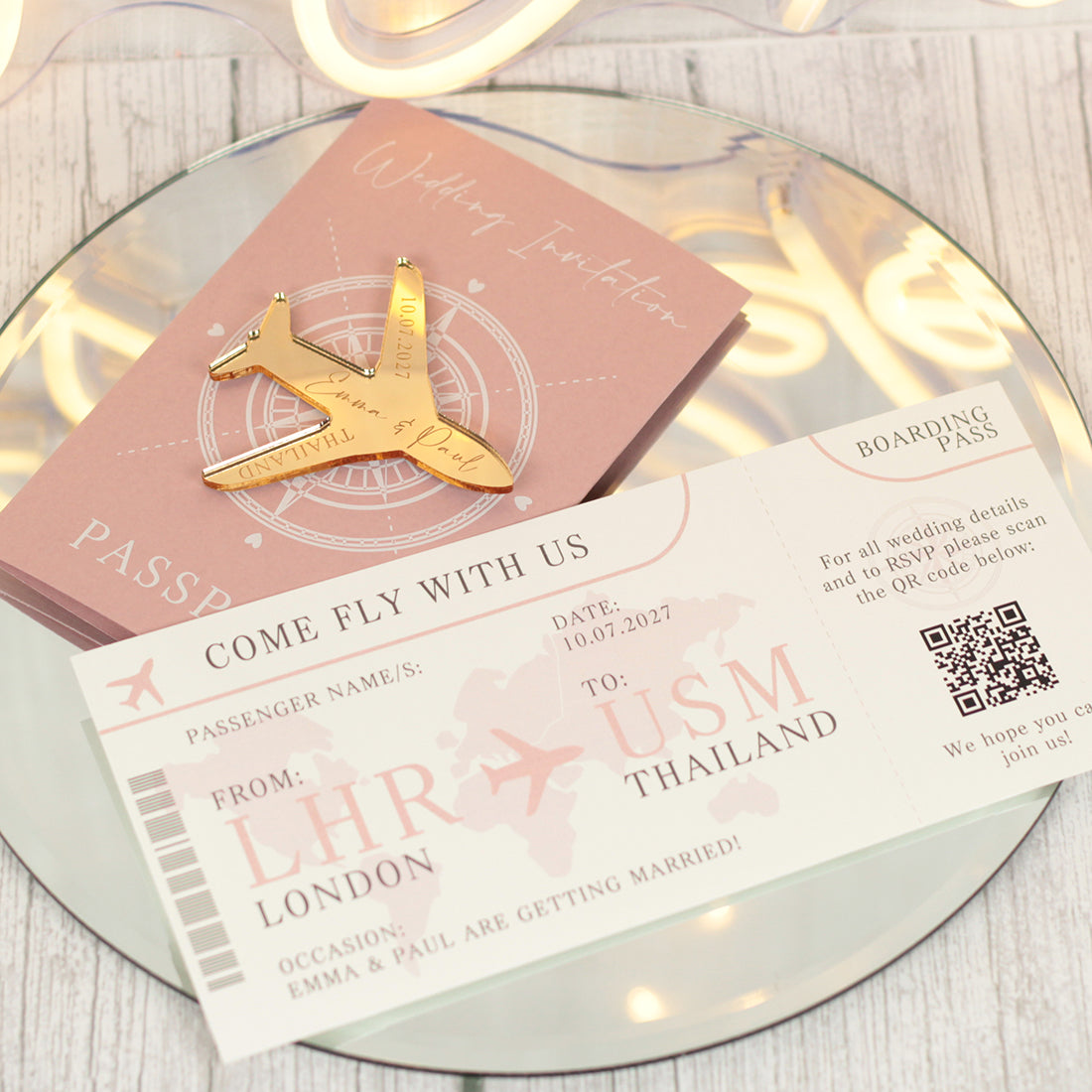 The boarding pass invitation is personalised with your wedding details and has space for a QR code which is a great way to send guests easily to your wedding website as there is often a lot of information to give to your guests (such as travel arrangements and hotel information) which can clutter up the invitation itself.