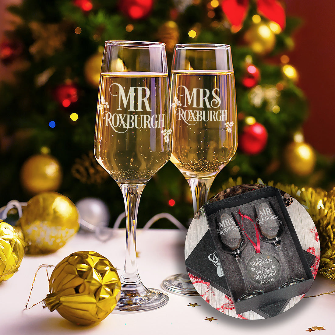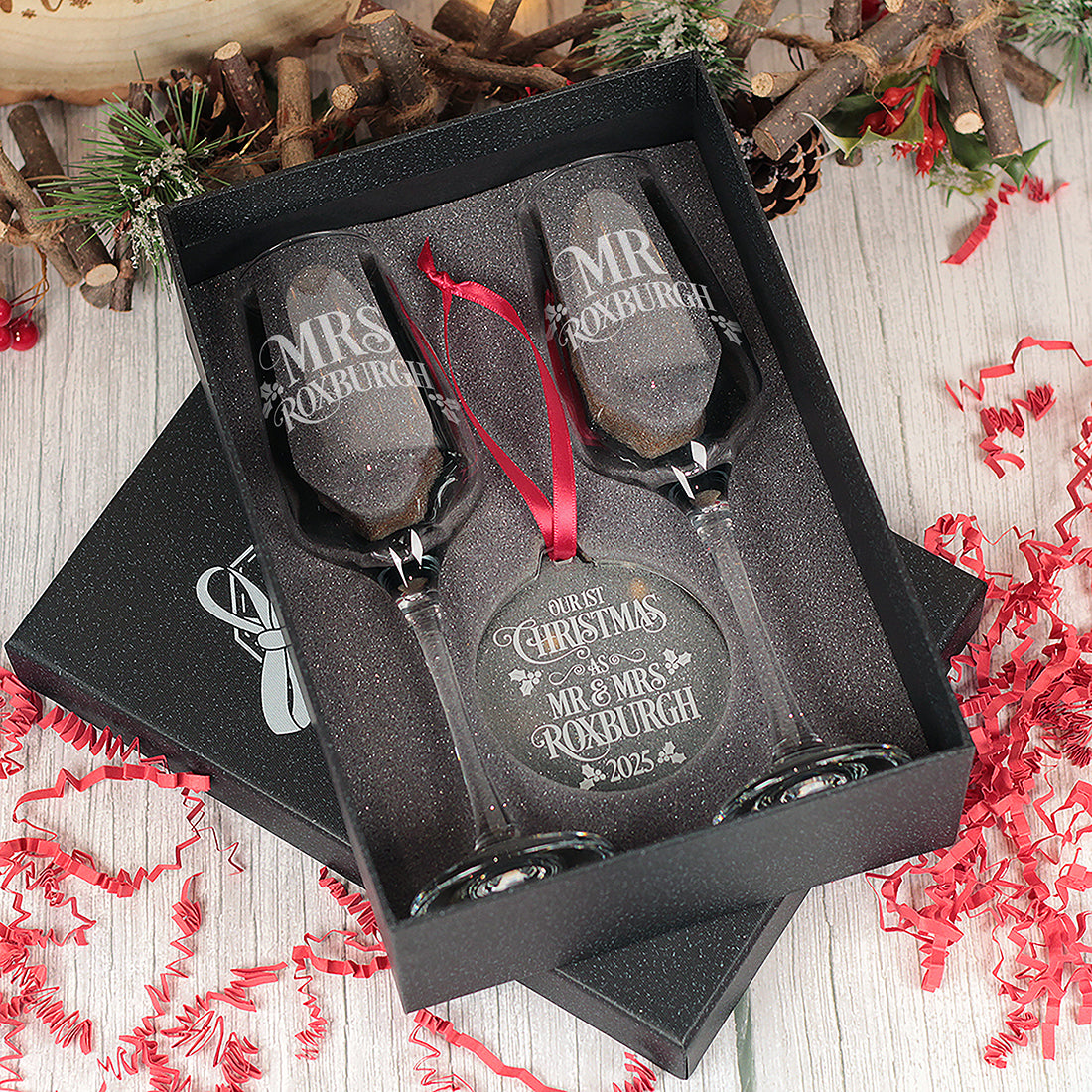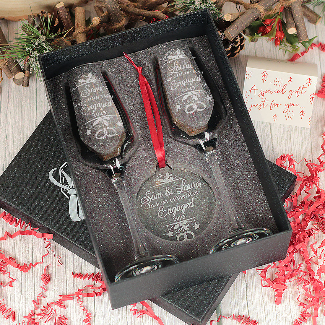 1st Christmas Engaged Pair of Champagne Flutes and Keepsake Bauble