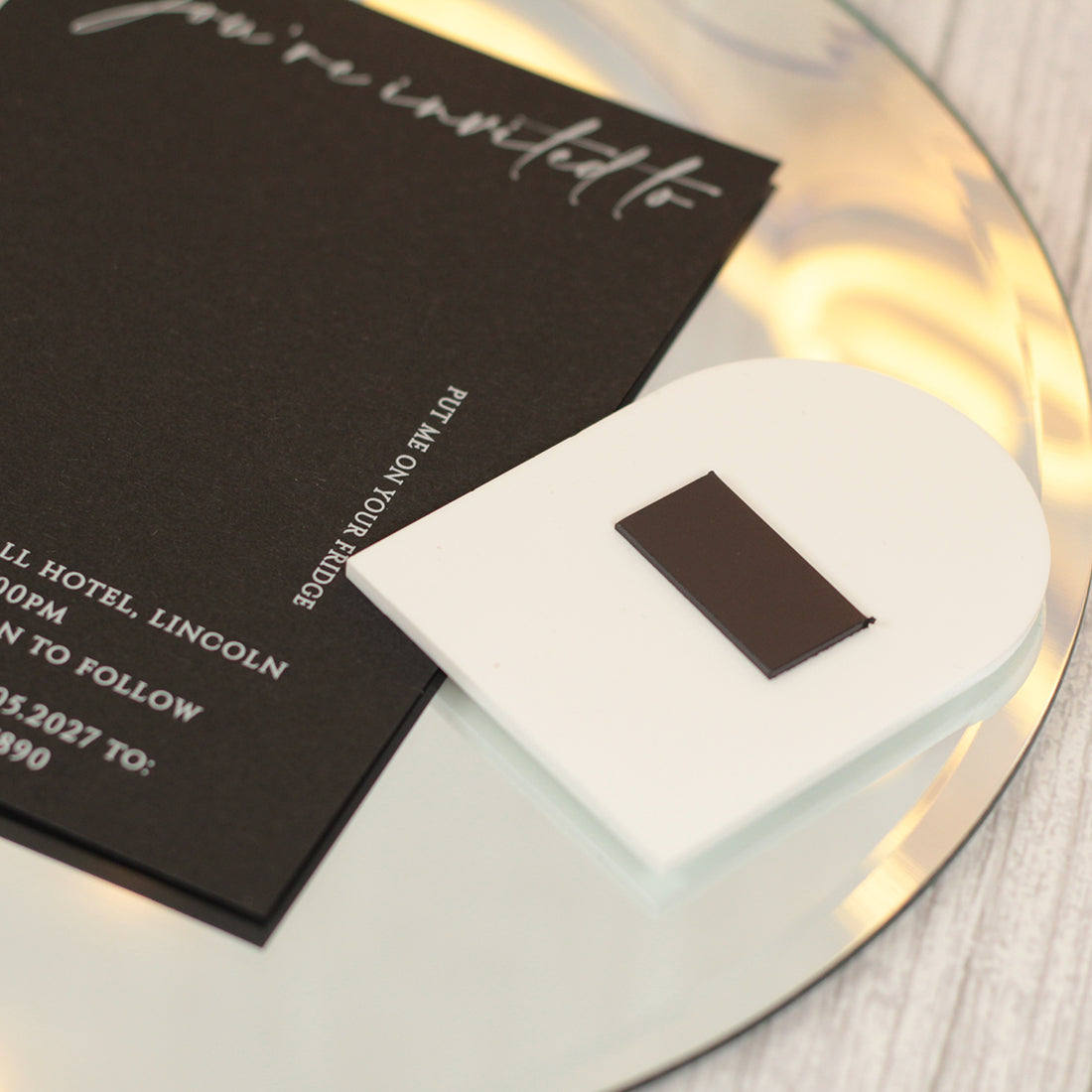 The text is UV printed onto the matte acrylic for a modern and durable finish. For all card colours except for white, the magnet will be in white with an ink colour to match the card. If you would like a white card, we then use a coloured acrylic with white ink.