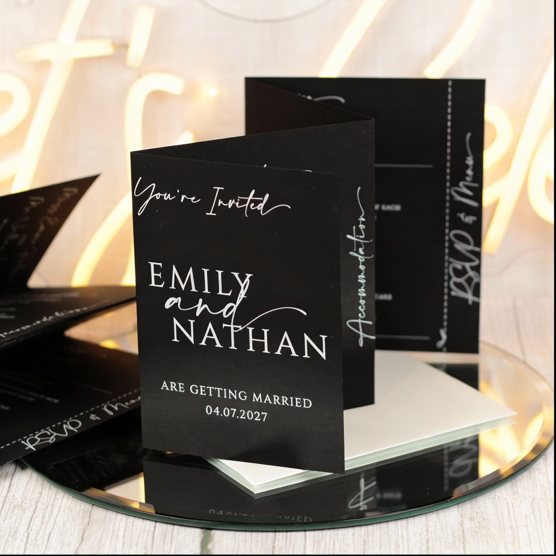 This design is available as either the concertina wedding invitation, vellum wrap bundle or A6 evening postcard.