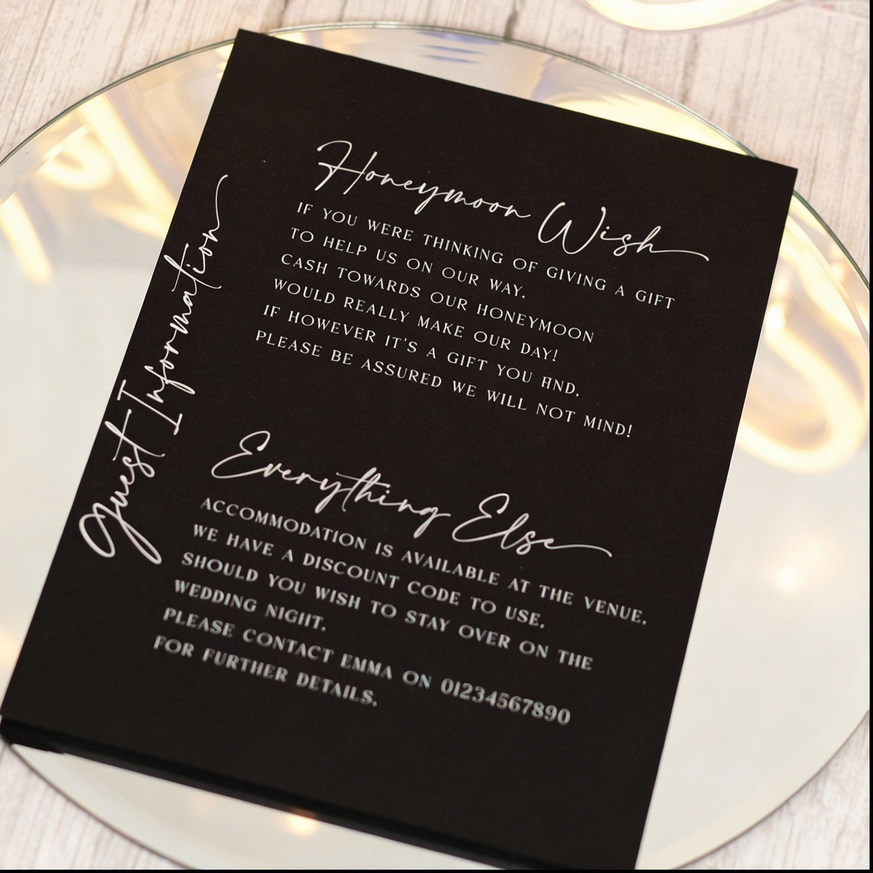 Within the bundle there is also an additional information card and RSVP postcard. The additional information card allows you to communicate important information to your guests, for example directions, accommodation, gift wish or menu choice options. The separate RSVP postcard is included to encourage your guests to reply with ease and can be customised to include menu choice options if needed.