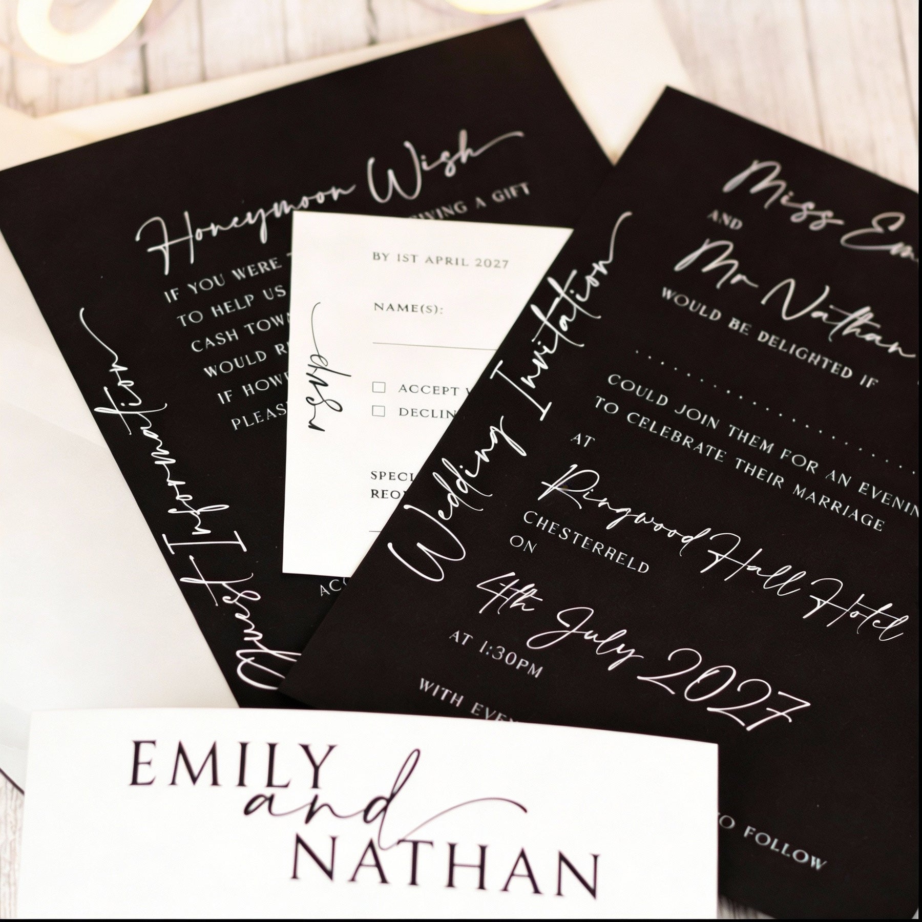 We can print your invitations onto a wide selection of card colours that match our acrylic range - please see the colour chart image for available colours. The RSVP card and belly band are in white card for a contrast with the text printed in the colour to match your chosen card colour for the other item.