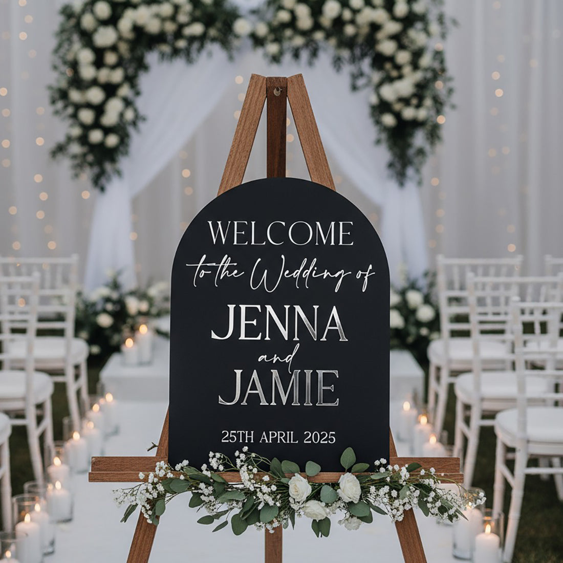 This stunning acrylic 'Welcome to Our Wedding' sign is a stylish way to welcome your guests on your wedding day or to the entrance of your wedding reception venue.