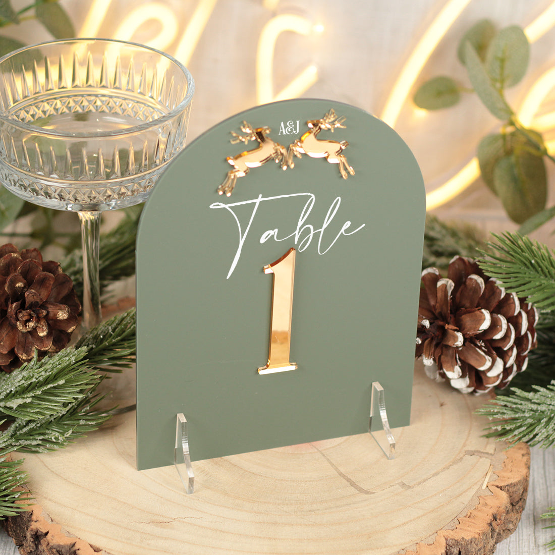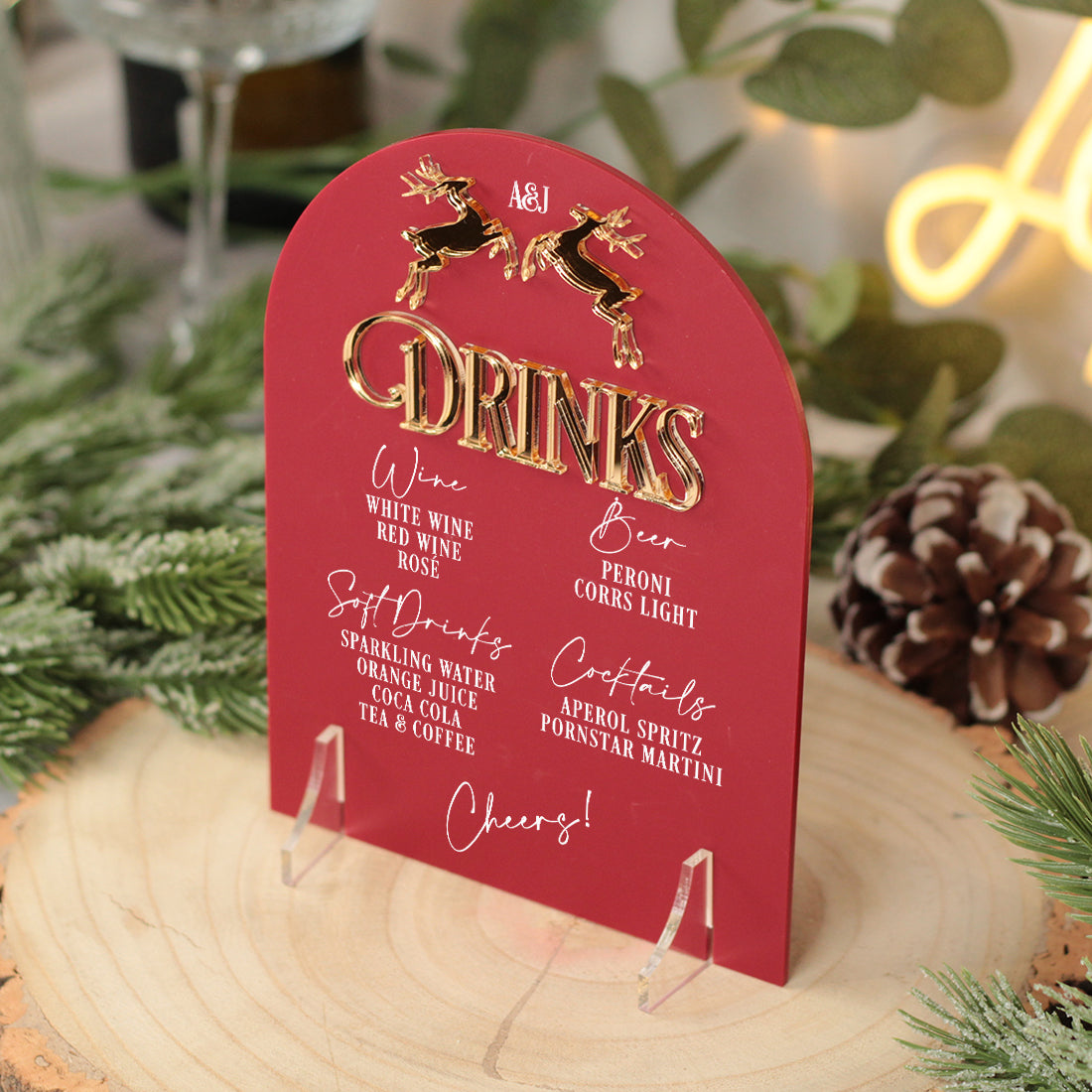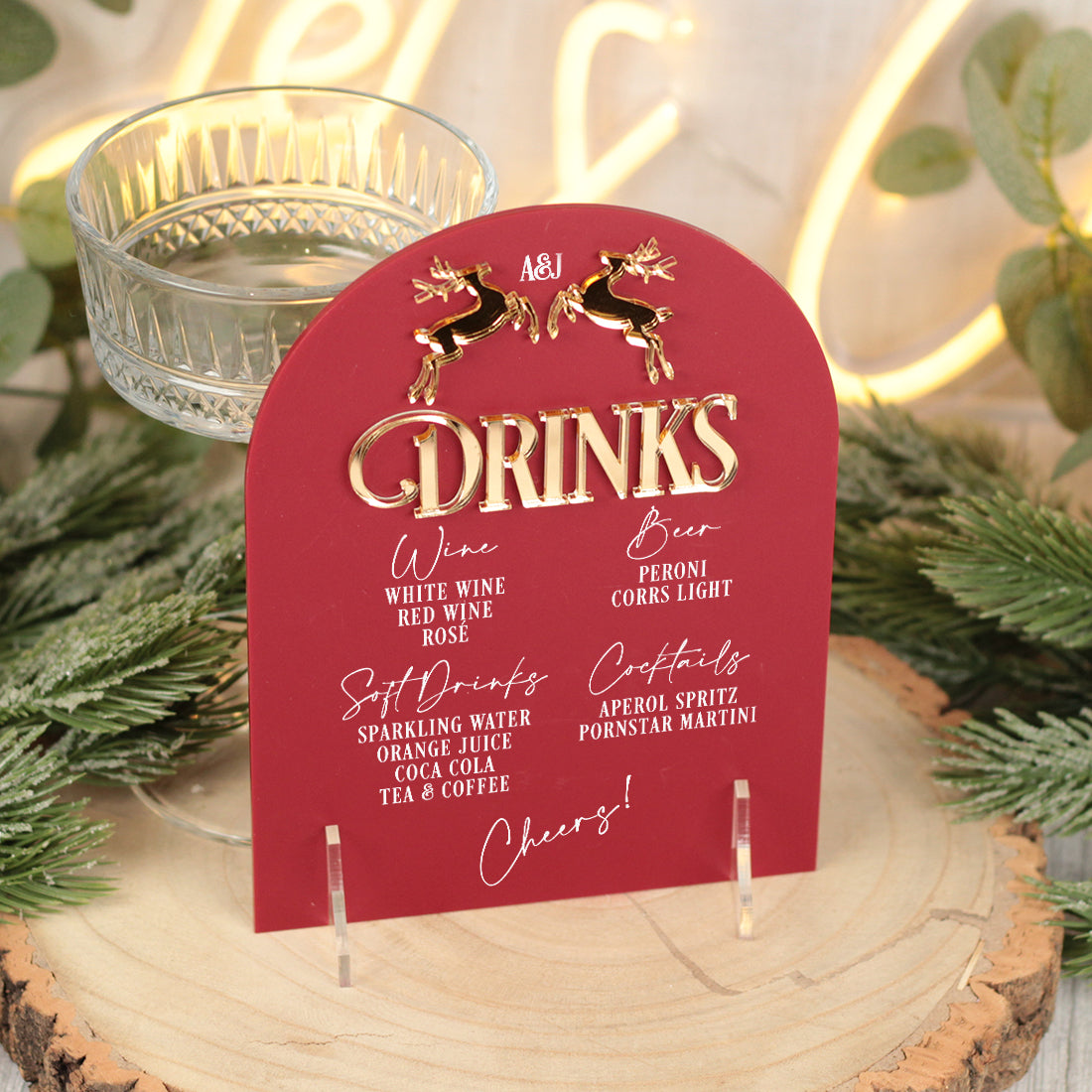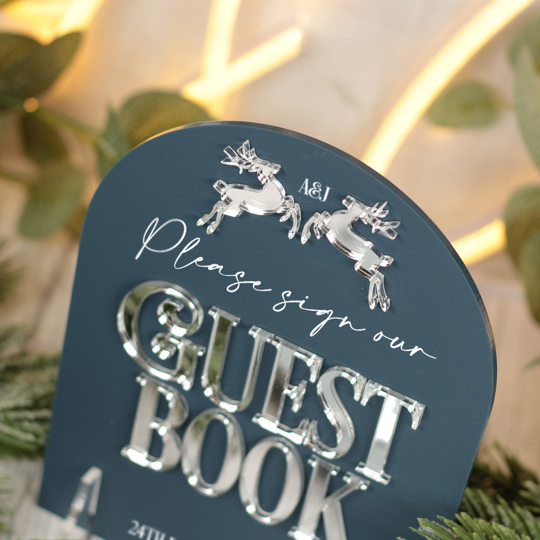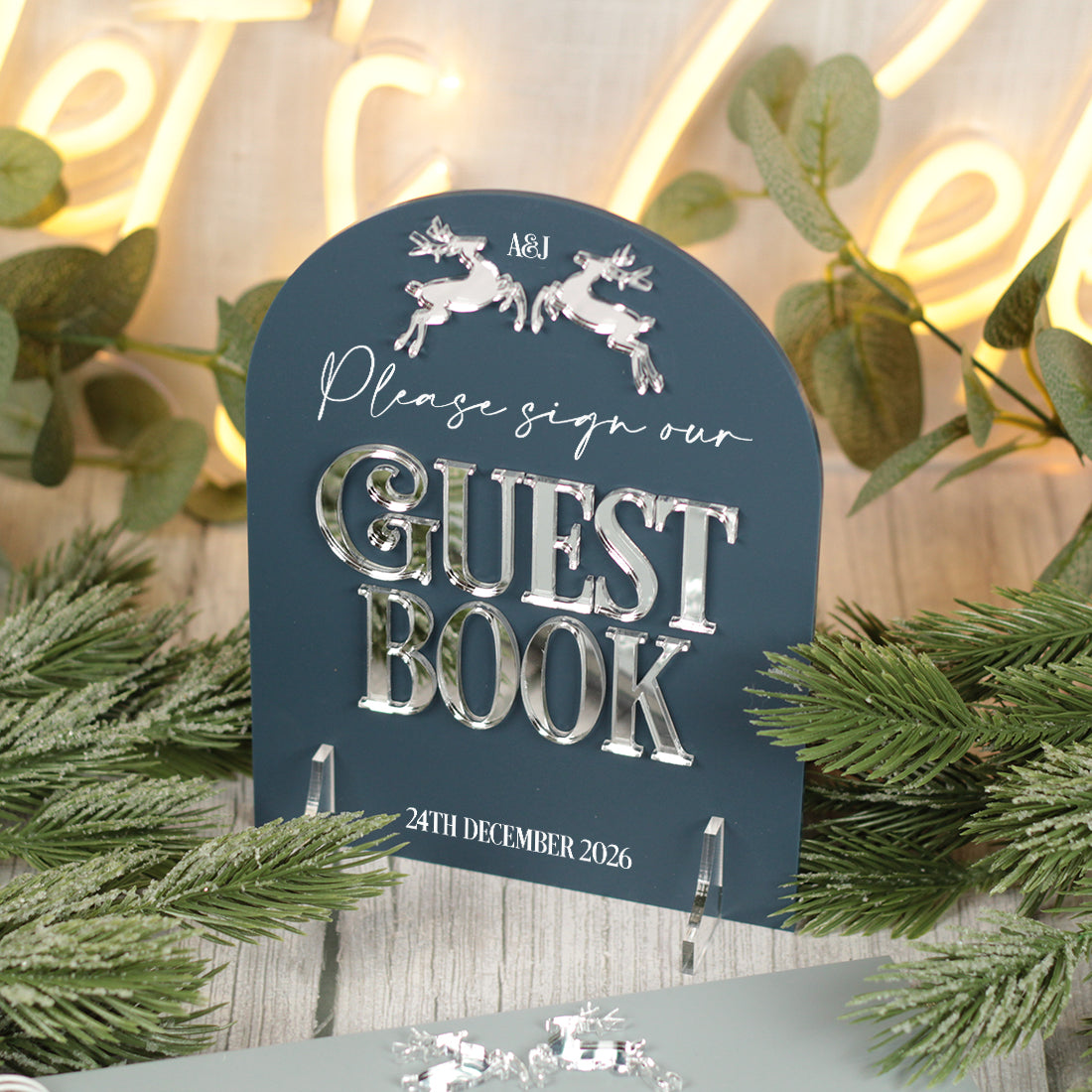 Featuring a charming pair of prancing reindeer, delicately laser cut from mirrored acrylic. each piece offers a subtle yet elegant nod to the festive season, perfectly complementing a simple but classic design.
