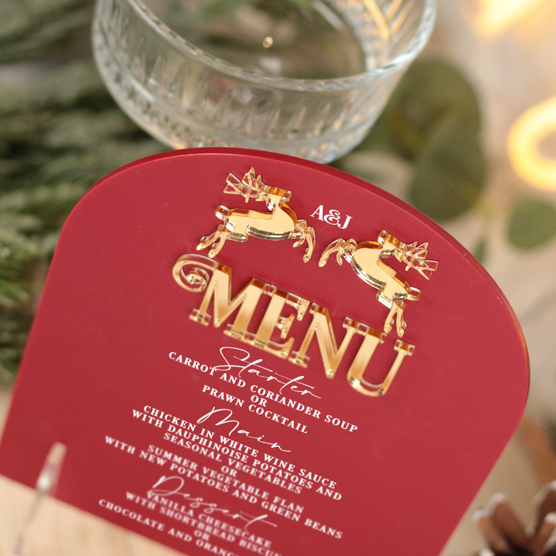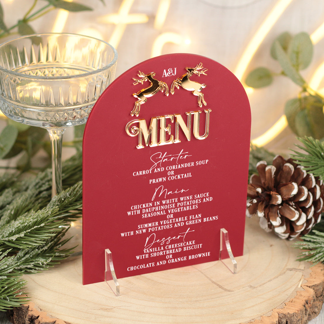 The sleek and modern design is the perfect match for your Christmas wedding. The sign features the main arch being made from high quality matte acrylic in a choice of colours to tie in with your wedding theme. The prancing reindeer and and the word 'Menu' are laser cut from either rose gold, gold or silver mirrored acrylic to create a stunning3D effect. The mirror catches the light beautifully so looks stunning displayed on your reception tables. The acrylic sits on a pair of clear acrylic feet so it can stand wherever you choose.
