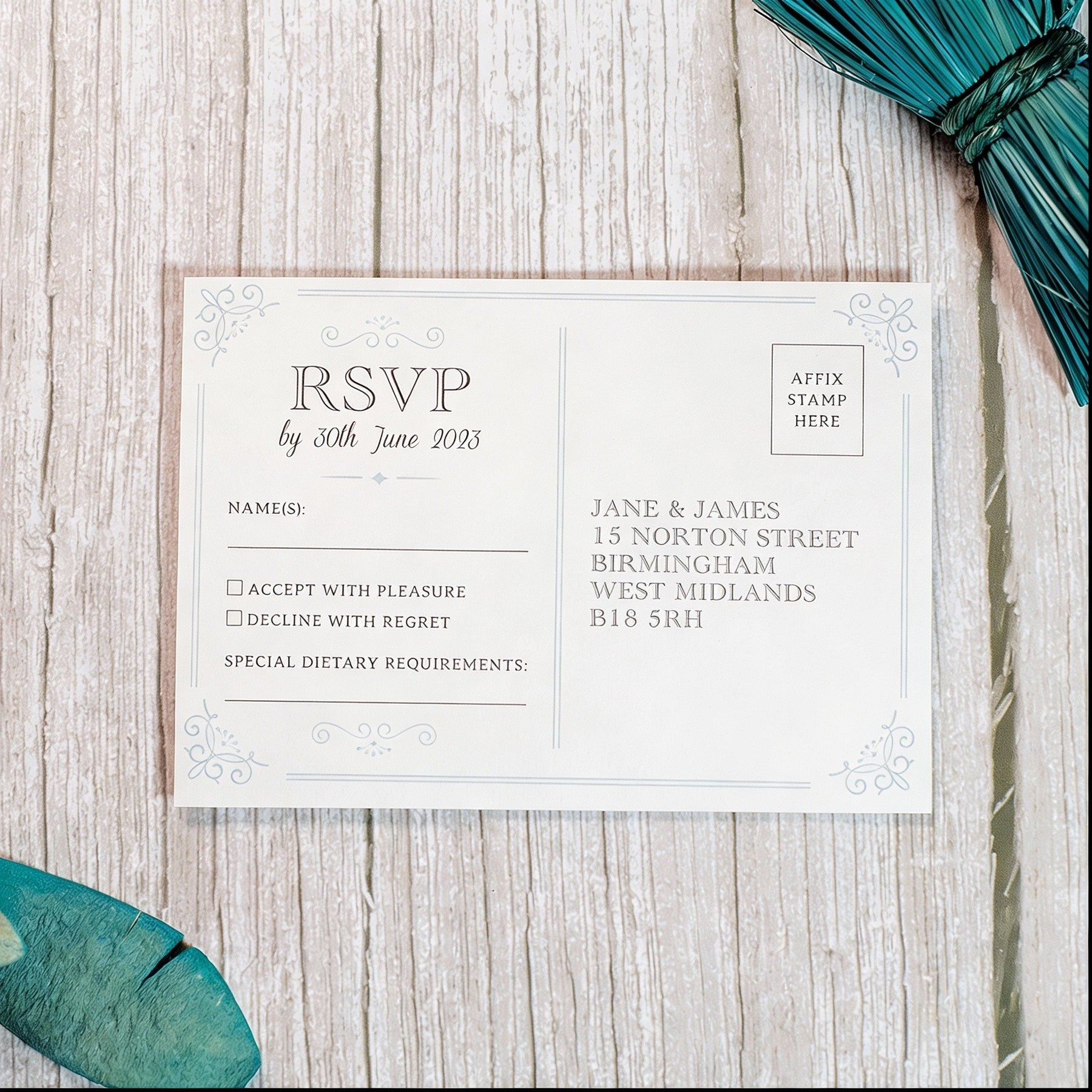 This vintage scroll themed design is available as an A5 postcard invitation for you to send to your guests with all your wedding details.