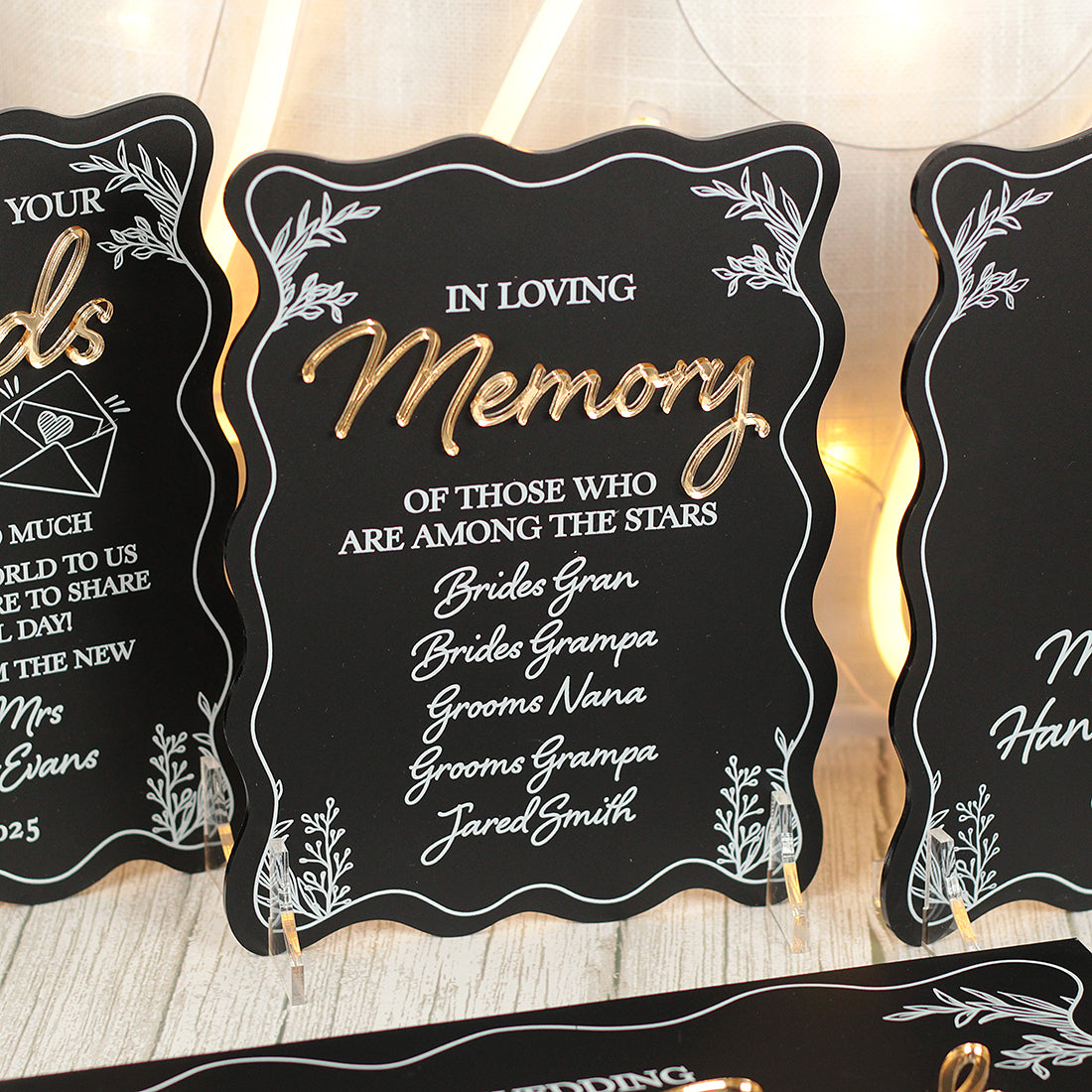 Create WOW factor wedding signage for your big day with our range of Wavy Edge wedding signage. Cut into a wavy edge shape and finished with 3D mirrored lettering, this range of signage is sure to get noticed whilst directing your guests around your venue. Available in a wide range of matt pastel acrylics.
