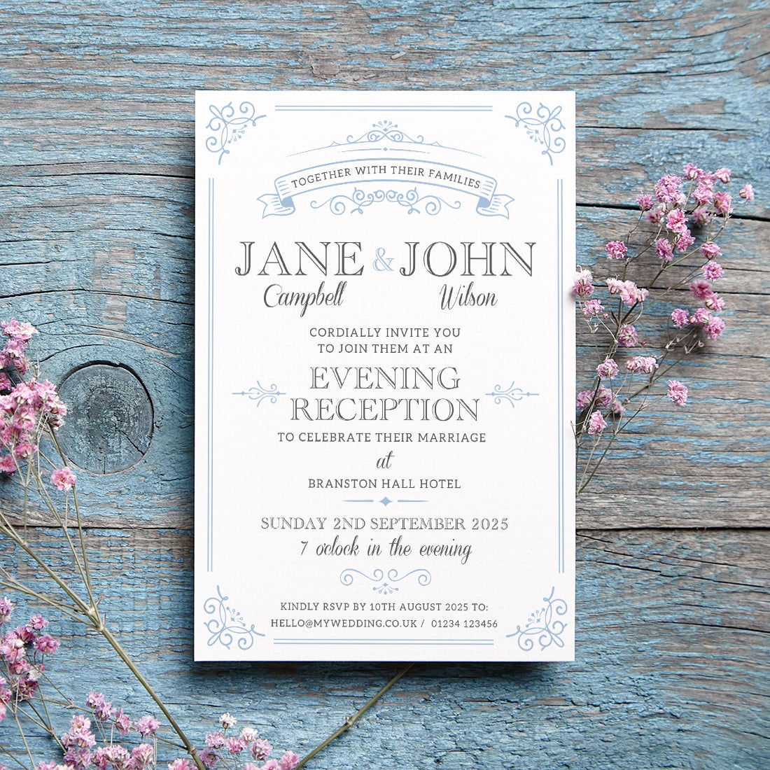 The invitations can be worded to suit your desired formality and who is hosting the wedding - visit our wording suggestions page for ideas or provide us with your own choice of wording. They can also be personalised to suit all day Wedding guests as a budget friendly option.