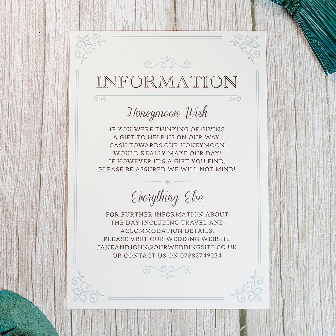 Also available to complete the set are optional guest information cards. The additional information cards are ideal if you need to advise your guests of any other important information, for example directions, accommodation or gift list details.
