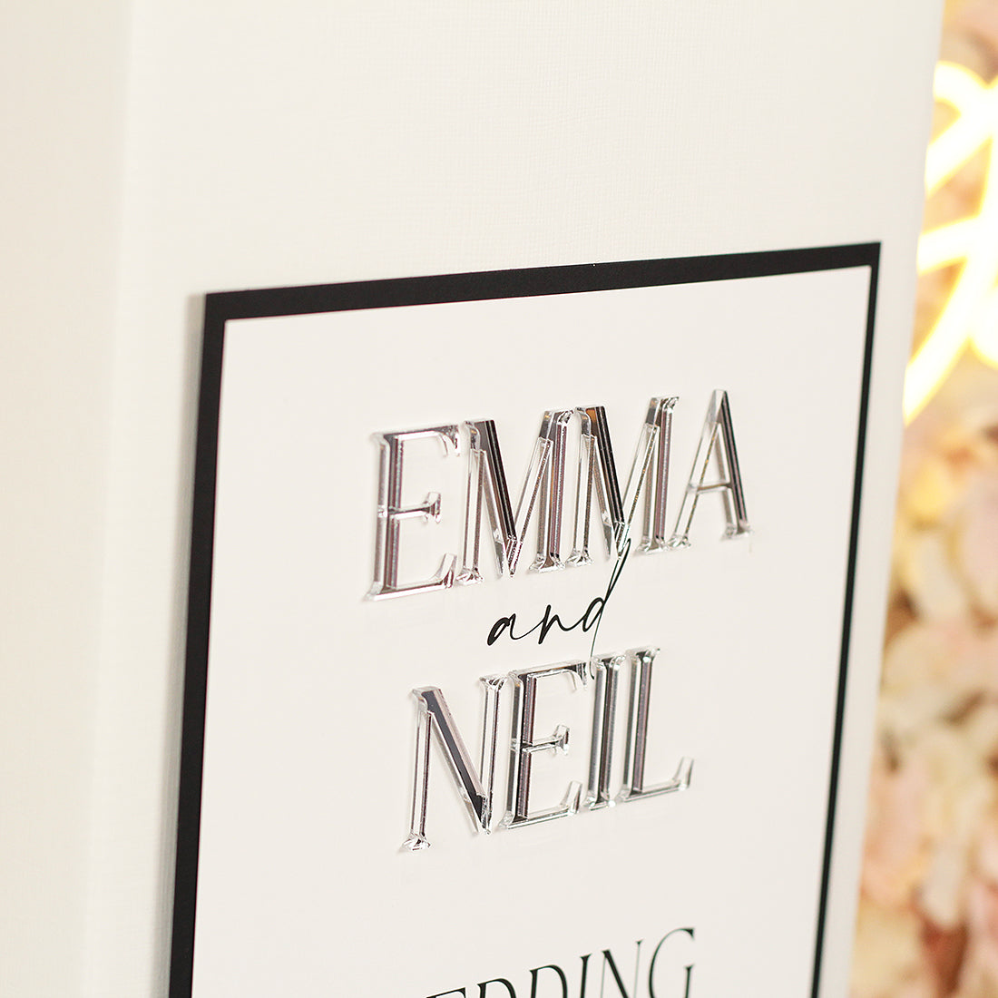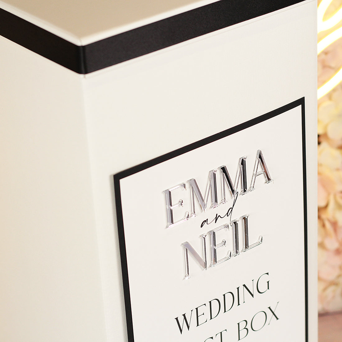 The design matches our Manhattan acrylic collection with the text, backing card and ribbon around the lid in a choice of colours. For an added touch of luxury we use our stunning 3D mirrored acrylic for your names in either rose gold, silver or gold mirrored acrylic.