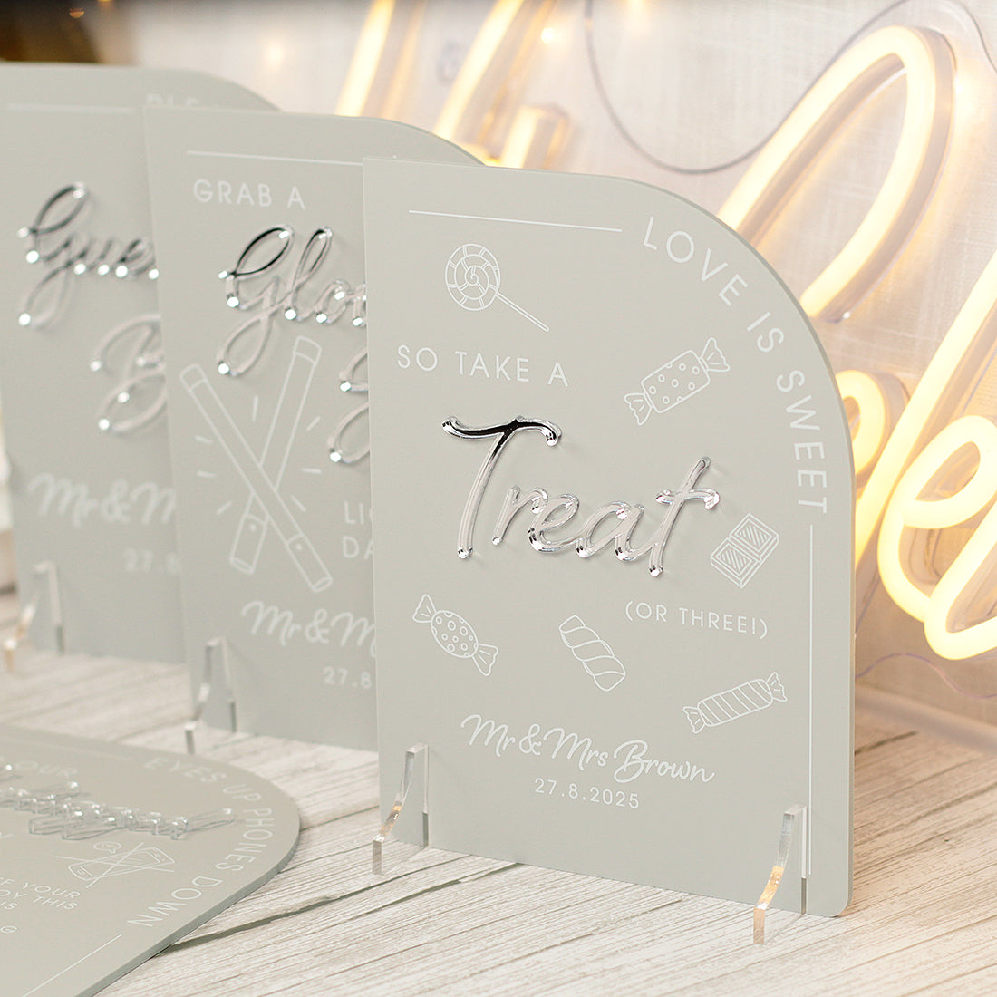 The sleek and modern design is versatile to blend in with any wedding theme. The sign features the main arch being made from high quality matte acrylic in a choice of colours and the message 'Love is sweet so take a treat' with the word 'treat' being laser cut from either rose gold, gold or silver mirrored acrylic to create a 3D effect. The mirror catches the light beautifully so looks stunning displayed on your sweet cart or bar. The acrylic arch sits on a pair of clear acrylic feet so it can stand wherever you choose.