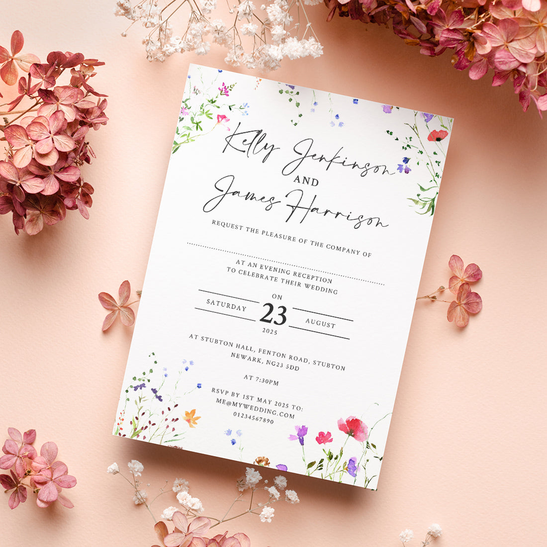 This Watercolour Wildflower design is available as an A6 postcard invitation for you to send to your guests who you are inviting to your Evening Reception.